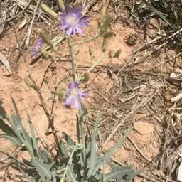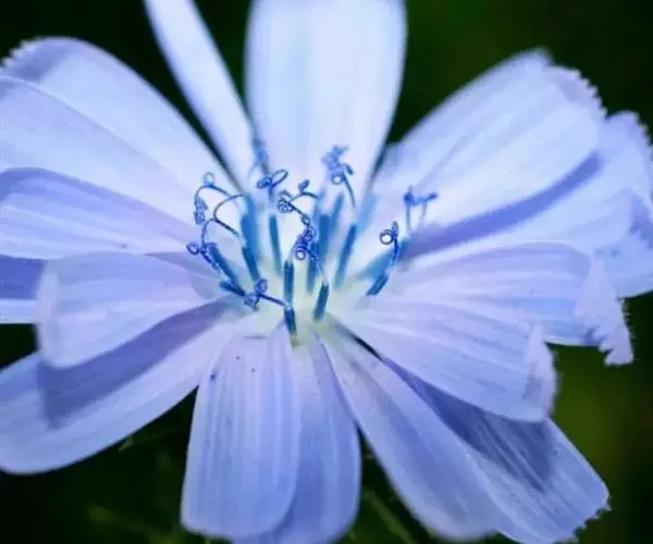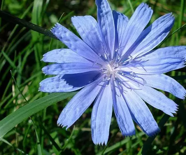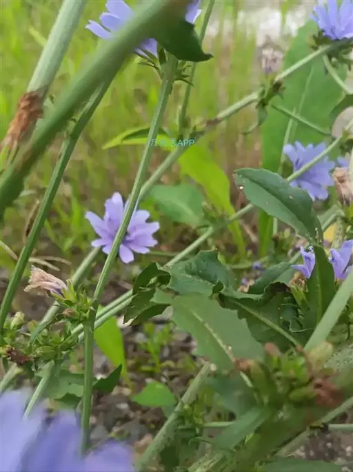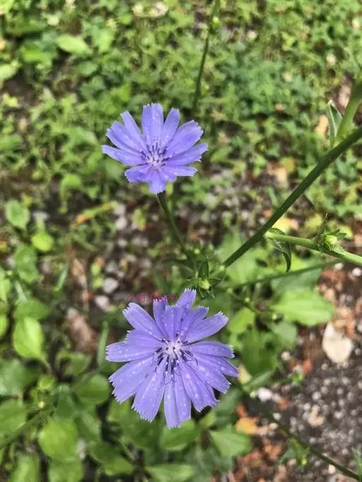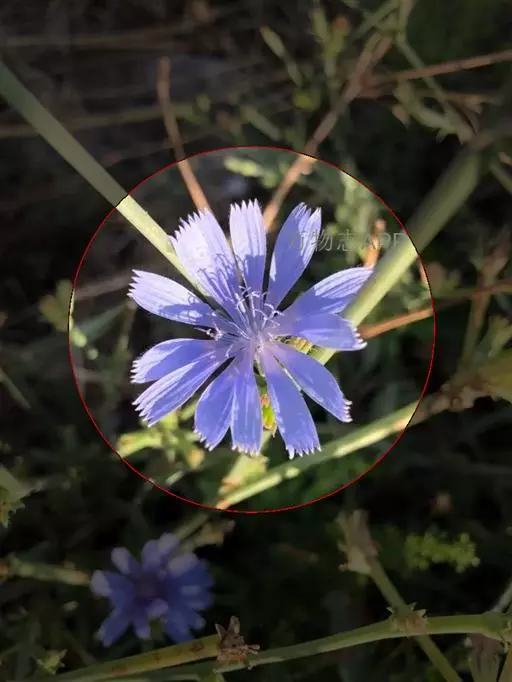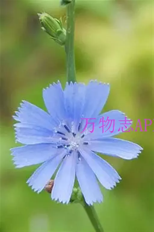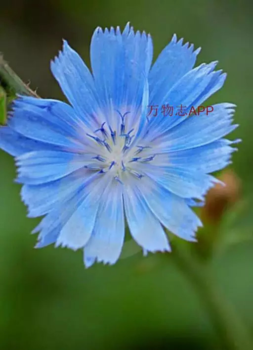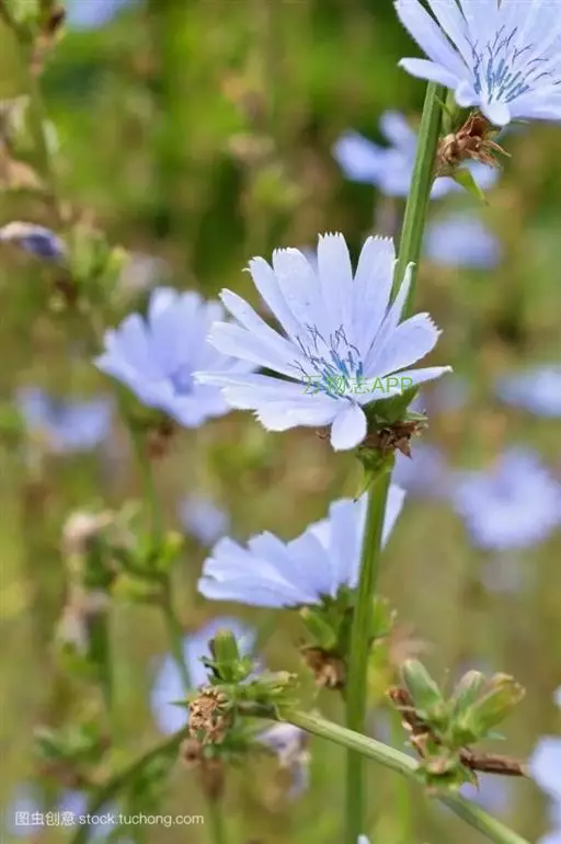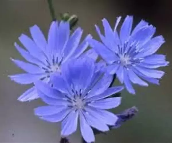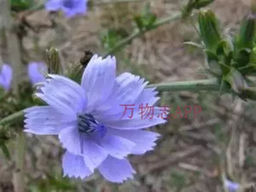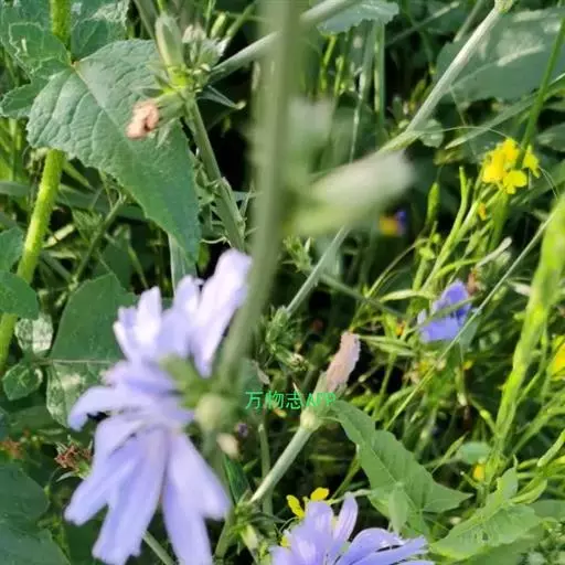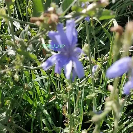 3、菊苣:茎表面近光滑。茎生叶少,长圆状披针形。头状花序少数,簇生;苞片外短内长,无毛或先端被稀毛。瘦果鳞片状,冠毛短,长0.2~0.3mm。