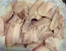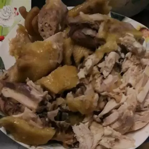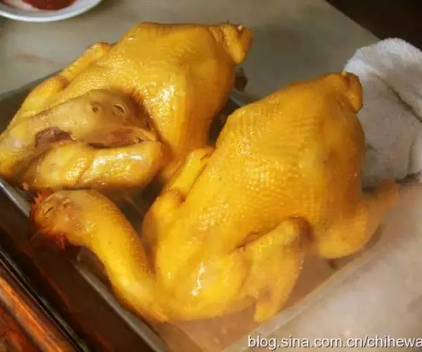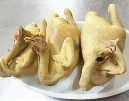 ②将鸡洗净,放水中净煮,中间提出两次,倒出腔中的水,以保持内外温 准备工作 度一致。约浸十五分钟至熟,用铁钩勾起,再放在冷开水中浸没冷却,并洗去绒毛、黄衣,随即捞起。焖着十分钟,晾干表皮,扫上熟花生油,斩成小块,盛入碟中,摆成鸡形。以斩出来的鸡块骨髓带血为适,斩件后,点着调料吃。