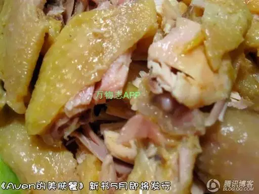 3、取出沥干,斩成约1-2公分鸡块,淋自家炮制的作料即成。