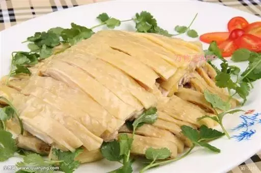 原料:嫩油鸡1只(1.25千克)、香菜5克。 白斩鸡