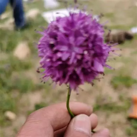 鳞茎单生或2-3枚聚生,近圆柱状;鳞茎外皮灰褐色至黑褐色,破裂成纤维状,呈明显的网状。叶2枚,紧靠或近对生状,很少为3枚,常为条形、条状披针形、椭圆状披针形或椭圆状倒披针形,罕为狭椭圆形,短于或近等于花葶,宽0.5-4(-7)厘米,先端渐尖,基部逐渐收狭成不明显的叶柄。花葶圆柱状,高10-60厘米,下部被叶鞘;总苞1-2裂,宿存;伞形花序半球状,具多而密集的花;小花梗近等长,比花被片长2-4倍,果期更长,基部无小苞片;花紫红色至淡红色,稀白色;内轮的花被片披针状矩圆形至狭矩圆形,长4-7毫米,宽1-1.5(-2.5)毫米,先端钝或凹缺,或具不规则小齿,外轮的宽而短,狭卵形、矩圆状卵形或矩圆形,长3.2-5.5毫米,宽1.4-2(-2.9)毫米,先端钝或凹缺,或具不规则小齿;花丝比花被片略长或长得多,基部合生并与花被片贴生,内轮的狭卵状长三角形,基部宽0.8-1.5毫米,外轮的锥形;子房具3圆棱,基部收狭成长约0.5毫米的短柄,每室1胚珠。花果期6月底到9月。