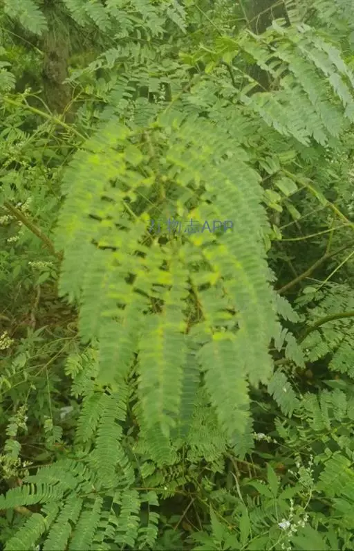 灌木或小乔木,高2-6米;幼枝被短柔毛,老枝无毛,具褐色皮孔,无刺;托叶三角形,小。羽片4-8对,长5-9(-16)厘米,叶轴被柔毛,在最下一对羽片着生处有黑色腺体1枚;小叶5-15对,线状长圆形,长7-13毫米,宽1.5-3毫米,先端急尖,基部楔形,边缘被短柔毛,中脉偏向小叶上缘,两侧不等宽。
