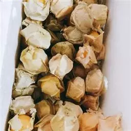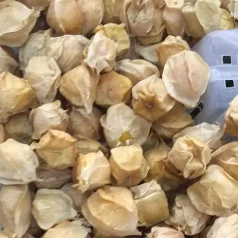 宿萼膨大而薄,略呈灯笼状,多皱缩或压扁,长2.5-4.5cm,直径2-4cm;表面橘红色或淡绿色,有5条明显的纵棱,棱间具网状细脉纹,先端渐尖,微5裂,基部内凹,有细果柄。体轻,质韧,中空,或内有类球形浆果,直径约1.2cm,橘黄色或橘红色,表面皱缩,内含多数种子。种子细小,扁圆形,黄棕色。气微,宿萼味苦,果实微甜、微酸。以个大、色鲜红者为佳。