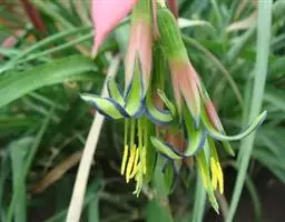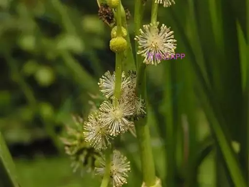 圆锥花序开展,长20-60厘米,具3-7个侧枝,每个侧枝上着生7-11个雄性头状花序和1-2个雌性头状花序,主轴顶端通常具3-5个雄性头状花序,或更多,无雌性头状花序;花期雄性头状花序呈球形,直径约10毫米;雄花花被片匙形,膜质,先端浅裂,早落,花丝长约3毫米,丝状,弯曲,褐色,花药近倒圆锥形,长约1-1.2毫米,宽约0.5毫米;雌花花被长5-7毫米,宽约1-1.5毫米,着生于子房基部,宿存,柱头分叉或否,长约3-4毫米,向上渐尖,花柱长约1.5毫米,子房无柄。果实长6-9毫米,倒圆锥形,上部通常膨大呈冠状,具棱,褐色。花果期5-10月。
