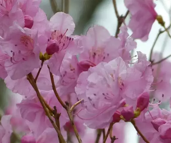 花序腋生枝顶或假顶生,1-3花,先叶开放,伞形着生;花芽鳞宿存;花梗长5-10毫米,疏生鳞片;花萼长0.5-1毫米,5裂,被鳞片,无毛或疏生刚毛;花冠宽漏斗状,长2.3-2.8厘米,径3-4厘米,淡红紫色,外面被短柔毛,无鳞片;雄蕊10,不等长,稍短于花冠,花丝下部被短柔毛;子房5室,密被鳞片,花柱光滑,长于花冠。
