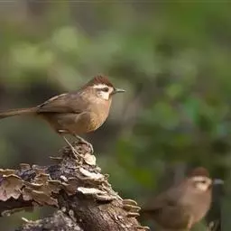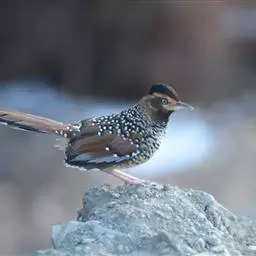 大噪鹛:中型鸟类,体长32-36厘米。额至头顶黑褐色,背栗褐色满杂以白色斑点,…