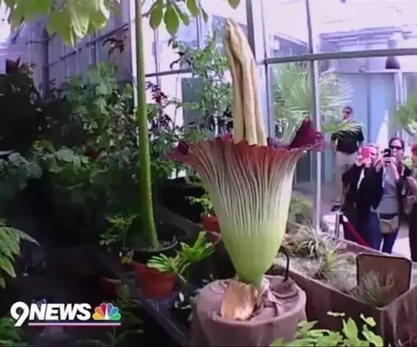 2014年5月12日,英国康沃尔郡的伊甸园主题园里,一株泰坦魔芋花(又名“尸花”)正盛开着,该花高9英尺3英寸(约2.8米),花朵散发着恶臭。常驻专家提姆·格里格(Tim Grigg)在2011年该花首次开放后对它进行了修剪,但是令他惊讶的是该花又一次绽放了。泰坦魔芋花一般生长7-10年后才会开花。经过两年的等待,康维尔伊甸园中的一束样本泰坦魔芋花终于开花了,这朵2.8米高的巨花差3.5英寸就能打破世界花朵最高记录,该园的园丁表示,该花一天能够生长6-8英寸,本来预计会在周末过后或是下周开花,但是它却提前开放了。