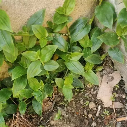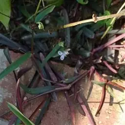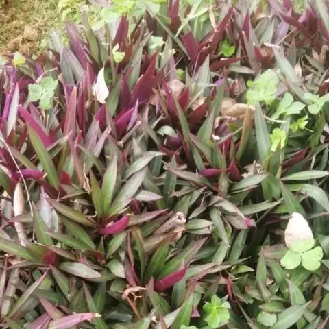 多年生常绿草本。茎匍匐,光滑,长可达60cm,带紫红色晕,有略膨大节,节处易生根。叶互生,长圆形或卵状长圆形,先端尖,下面深紫堇色,仅叶鞘上端有毛,具白色条纹。花小,多朵聚生成伞形花序,白色,为2叶状苞片所包被,花期夏、秋季。