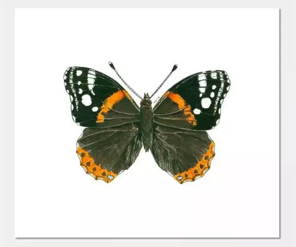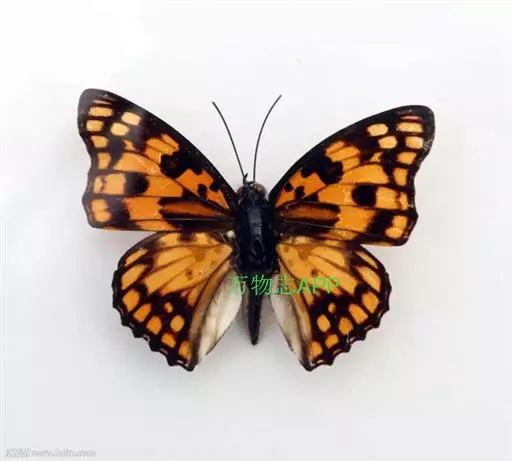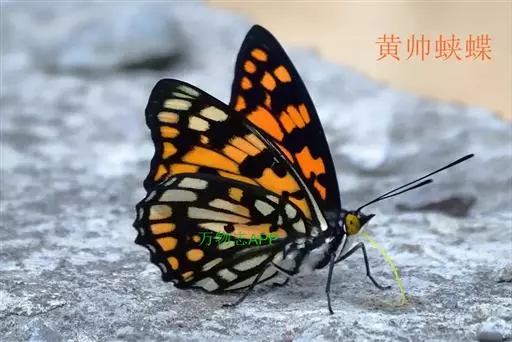 与帅蛱蝶近似,但雄蝶翅面黑色,所有条斑均橙黄色,无白色条斑,前翅中室内有二个橙黄色斑,前翅中域Cu1室斑眼状。雌蝶条斑的排列图案同雄蝶,但除前翅中室有二个黄色斑外,其余条斑均为白色。
