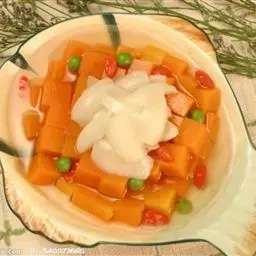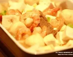 4. 趁热在挖出的土豆泥里放一块黄油拌匀(放牛奶也行),然后加入培根彩椒粒,用海盐黑胡椒调味。