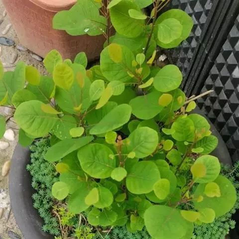 毛黄栌 灌木,高3-5米。叶倒卵形或卵圆形,长3-8厘米,宽2.5-6厘米,先端圆形或微凹,基部圆形或阔楔形,全缘,两面或尤其叶背显著被灰色柔毛,侧脉6-11对,先端常叉开;叶柄短。叶多为阔椭圆形,稀圆形,叶背、尤其沿脉上和叶柄密被柔毛。