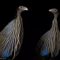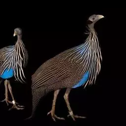 鹫珠鸡:是珠鸡科中体形最大的一种,因头颈部像兀鹫而得名。雌雄羽色相似,为黑色基底上遍布白色点斑,…