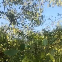 五月下旬现蕾开花,六月上旬为盛果期,七月出现幼果,11-12月果荚成熟。果荚由绿变黄时应及时采收,否则易被风吹落。果荚采回凉干后,除去杂质,进行贮藏,为防豆蟓的危害,贮藏前应进行种子处理,一般用一百比一的六六六粉剂或杀虫剂2%的巴丹粉剂拌种效果较好,保存到次年的雨季前播种育苗。果荚出种率仅为10%,种子千粒重约34.2克,发芽率60-70%。