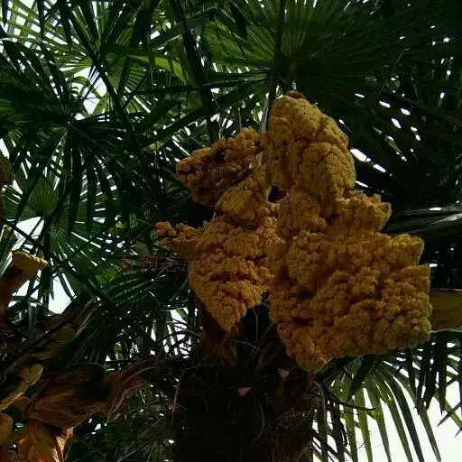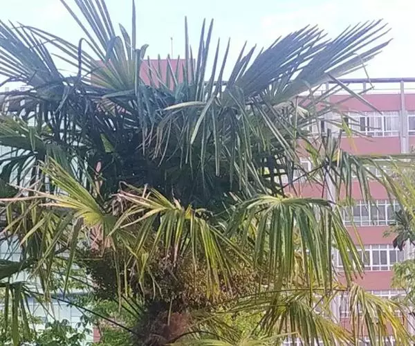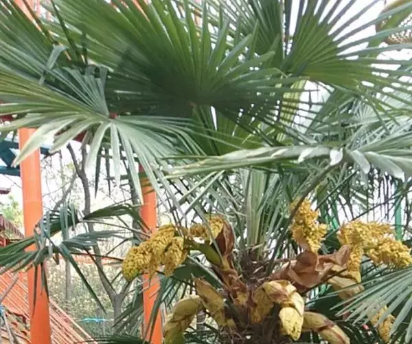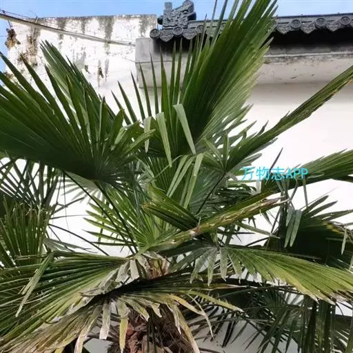 棕榈(学名:Trachycarpus fortunei (Hook.) H. Wendl.)属棕榈科常绿乔木,高可达7米;干圆柱形,叶片近圆形,叶柄两侧具细圆齿,花序粗壮,雌雄异株。花黄绿色,卵球形;果实阔肾形,有脐,成熟时由黄色变为淡蓝色,有白粉,种子胚乳角质。花期4月,果期12月