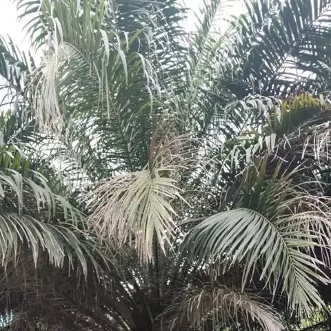 病害多从叶柄基部开始发生,首先产生黄褐色病斑,并沿叶柄向上扩展到叶片,病叶逐渐凋萎枯死。病斑延及树干产生紫褐色病斑,导致维管束变色坏死,树干腐烂;叶片枯萎,植株趋于死亡。若在棕榈干梢部位,其幼嫩组织腐烂,则更为严重。在枯死的叶柄基部和烂叶上,常见到许多白色菌丝体。当地上部分枯死后,地下根系也很快随之腐烂,全部枯死。病原为拟青霉菌。