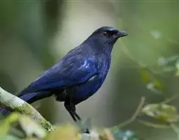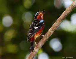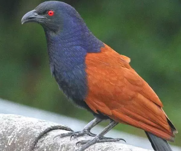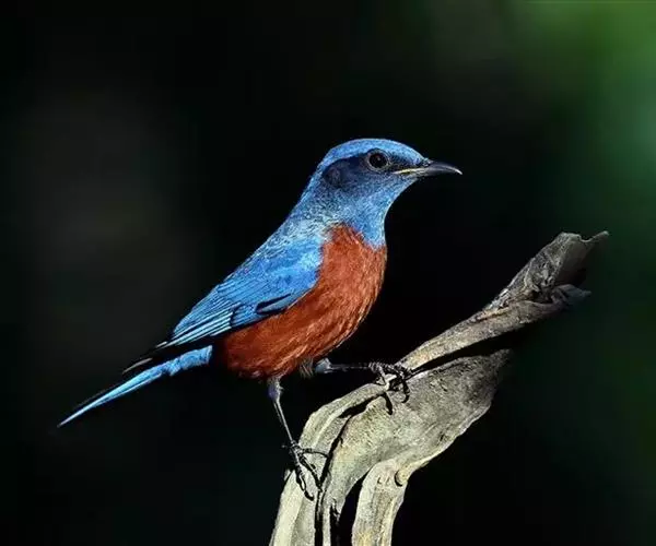 雄鸟从头到尾等整个上体亮钴蓝色,尤以头顶和腰最亮。上背和两肩沾黑。眼先、颊、耳羽、头侧和颈侧黑色。翅上小覆羽和中覆羽与背相同亦为钻蓝色沾黑,其余翅覆羽和飞羽黑色,除最外侧两枚初级飞羽外,其余飞羽和覆羽外翈均沾钴蓝色。中央尾羽钴蓝色,外侧尾羽内翈暗褐色,外翈亦为钴蓝色,因而尾外表面亦为钴蓝色,尤以羽缘较辉亮,尾下表面则为黑褐色。下体颏、喉黑色而缀有蓝色,其余下体栗红色,腋羽和翅下覆羽为栗红色。