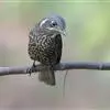 雌鸟上体包括两翅和尾在内翈为橄榄褐或灰橄榄褐色,尤以头顶至后颈较灰,背具黑色次端横斑和灰白色羽缘,在背形成隐约可见的黑色鳞状斑,到腰和尾上覆羽黑色横斑变得较为清晰可见。翅褐色具淡色羽缘,内侧覆羽亦大多具横斑。尾褐色、外翈稍沾灰蓝色。眼先和眼周棕白色或乳黄白色,耳羽黑色具淡白色羽轴纵纹,其后有一棕白色或皮黄斑,颈侧皮黄色。下体皮黄色或棕白色,颏、喉纯乳白色,其余下体密杂以黑褐色横斑或鳞状斑。