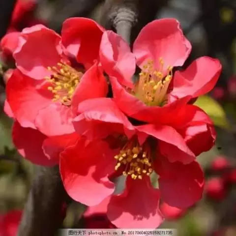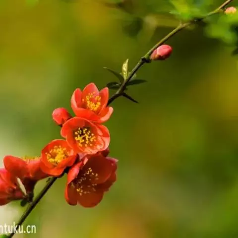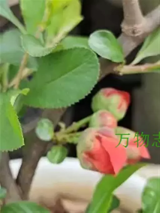 落叶灌木,高达2米,枝条直立开展,有刺;小枝圆柱形,微屈曲,无毛, 皱皮木瓜 紫褐色或黑褐色,有疏生浅褐色皮孔;冬芽三角卵形,先端急尖,近于无毛或在鳞片边缘具短柔毛,紫褐色。叶片卵形至椭圆形,稀长椭圆形,长3-9厘米,宽1.5-5厘米,先端急尖稀圆钝,基部楔形至宽楔形,边缘具有尖锐锯齿,齿尖开展,无毛或在萌蘖上沿下面叶脉有短柔毛;叶柄长约1厘米;托叶大形,草质,肾形或半圆形,稀卵形,长5-10毫米,宽12-20毫米,边缘有尖锐重锯齿,无毛。花先叶开放,3-5朵簇生于二年生老枝上;花梗短粗,长约3毫米或近于无柄;花直径3-5厘米;萼筒钟状,外面无毛;萼片直立,半圆形稀卵形,长3-4毫米。宽4-5毫米,长约萼筒之半,先端圆钝,全缘或有波状齿,及黄褐色睫毛;花瓣倒卵形或近圆形,基部延伸成短爪,长10-15毫米,宽8-13毫米,猩红色,稀淡红色或白色;雄蕊45-50,长约花瓣之半;花柱5,基部合生,无毛或稍有毛,柱头头状,有不显明分裂,约与雄蕊等长。果实球形或卵球形,直径4-6厘米,黄色或带黄绿色,有稀疏不显明斑点,味芳香;萼片脱落,果梗短或近于无梗。花期3-5月,果期9-10月。