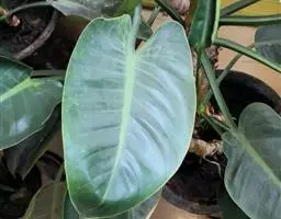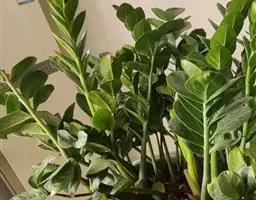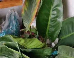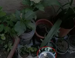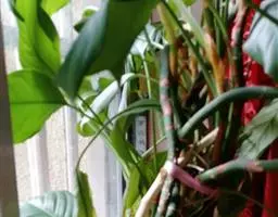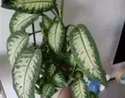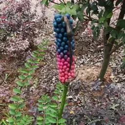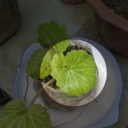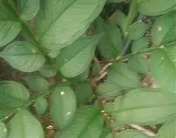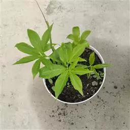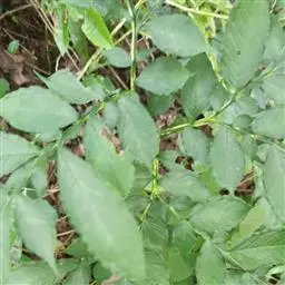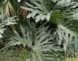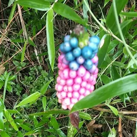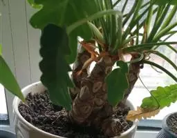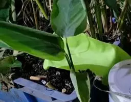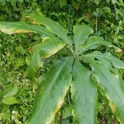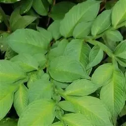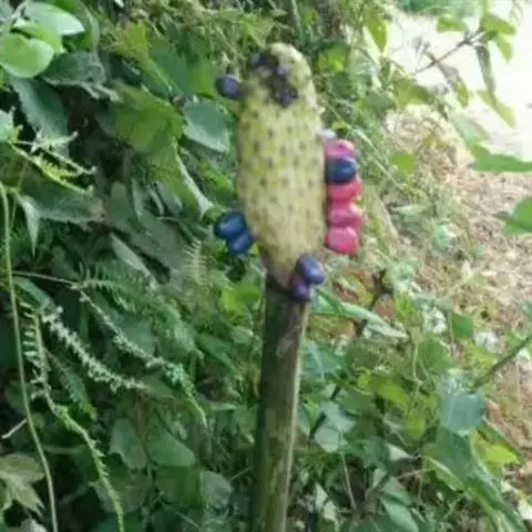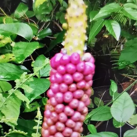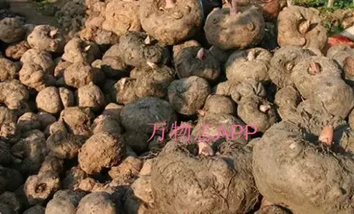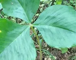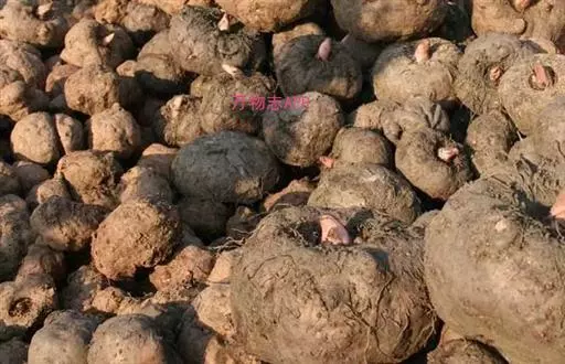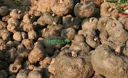 魔芋地下块茎为扁球形,个大,叶柄粗壮,圆柱形,淡绿色,有暗紫色斑,掌状复叶,里面是白色的。
