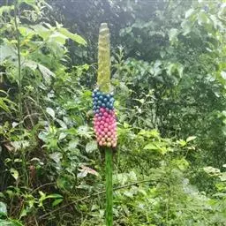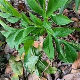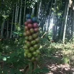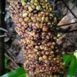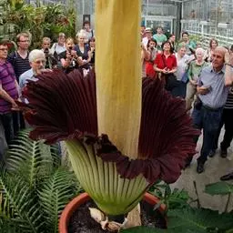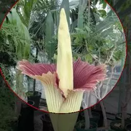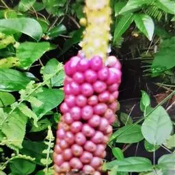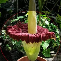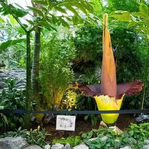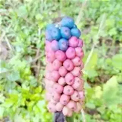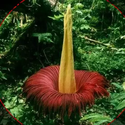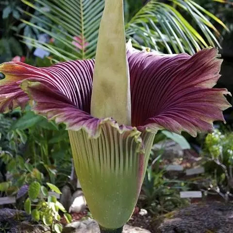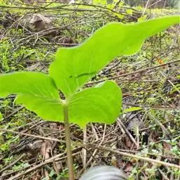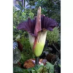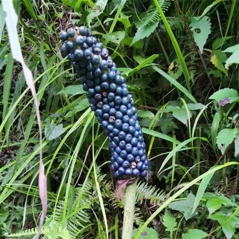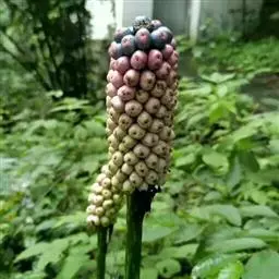 株高约40~70公分,地下有球茎,一株只长一叶,羽状复叶,叶柄粗长似茎,开花紫红色,有异臭味,地下球茎圆形。