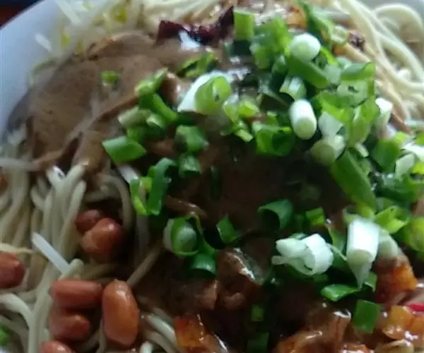 浇上芝麻酱汁和蒜味汁,撒上花生、辣萝卜干和香葱碎,拌匀即可食用。