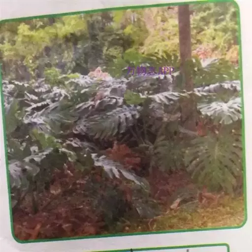 攀援灌木。茎绿色,粗壮,有苍白色的半月形叶迹,周延为环状,余光滑,长3-6米,粗6厘米,节间长6-7厘米,具气生根。叶柄绿色,长常达1米,腹面扁平,宽4-5厘米,背面钝圆,粗糙,边缘锐尖,基部甚宽,对折抱茎,排列为覆瓦状,形如鸢尾,两侧叶鞘宽,向上渐狭,脱落后叶柄边缘成绉波状;叶片大,轮廓心状卵形,宽40-60厘米,厚革质,表面发亮,淡绿色,背面绿白色,边缘羽状分裂,侧脉间有1-2个较大的空洞,靠近中肋者多为横圆形,宽1.5-4厘米,向外的为横椭圆形,宽5-6厘米;中肋及侧脉表面绿色,背面绿白色,两面均隆起;I次侧脉8-10对,基部的相互靠近,向上渐远离,II、III、IV级叶脉网状,不明显。