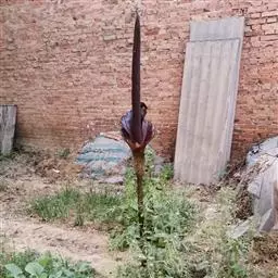 花序柄长15-30厘米,粗1-3厘米,绿色,粗糙。佛焰苞厚革质,宽卵形,舟状,近直立,先端具喙,长20-25厘米,人为展平宽15-17.5厘米,苍白带黄色。肉穗花序近圆柱形,长17.5-20厘米,粗4-5厘米,淡黄色。雄蕊花丝线形,花粉黄白色。雌蕊陀螺状,长7-8毫米,柱头小,线形,纵向,黄色,稍凸起。浆果淡黄色,柱头周围有青紫色斑点,长1厘米,粗7.5毫米。花期8-9月,果于异年花期之后成熟。