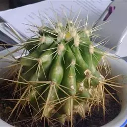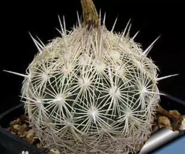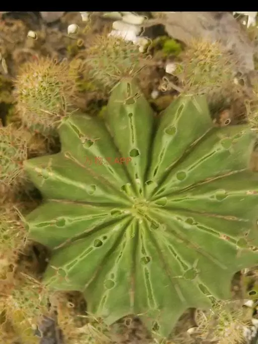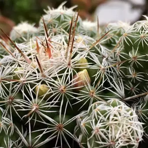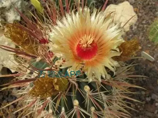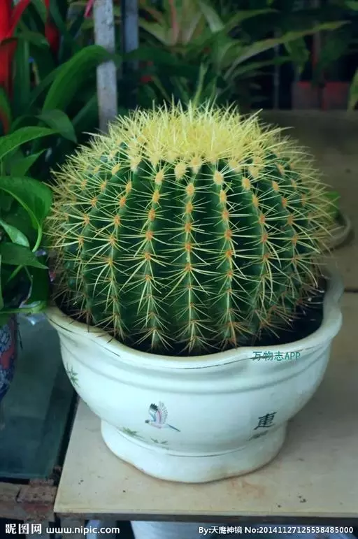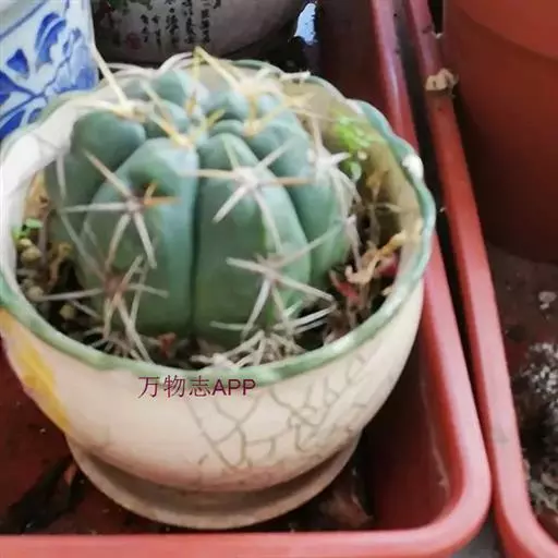 植物形态:多年生常绿肉质草本,高约15cm。茎球形,椭圆形或倒卵形,绿色,肉质,有纵棱12~14条,棱上有丛生的针刺,通常每丛6~10枚,少数达15枚,长2-4cm,硬直,黄色或黄褐色,长短不一,辐射状,刺丛内着生密集的白绒毛。中细小,生于刺丛内,早落。