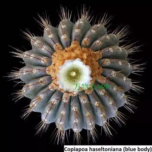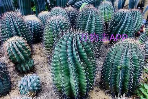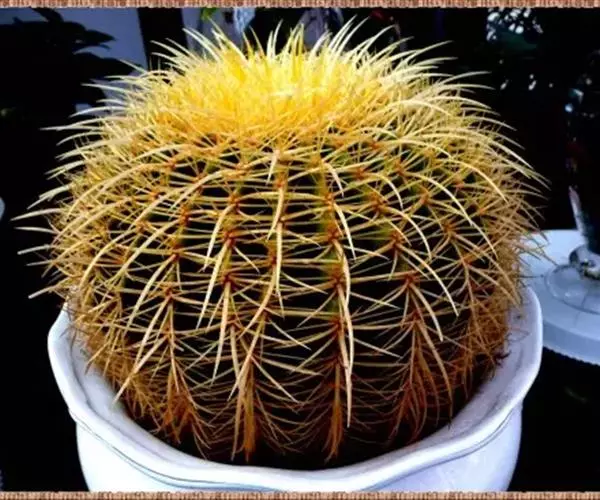 6、金琥:茎圆球形,单生或成丛。球顶密被金黄色绵毛。有棱21-37,显著。