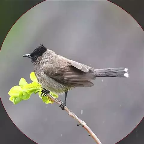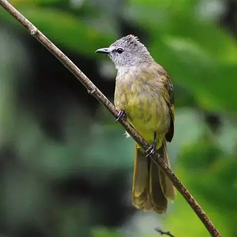 灰短脚鹎,体长19-22厘米。头顶和短的羽冠黑色,上体暗灰色,耳羽灰褐色,两翅表面橄榄绿黄色。…