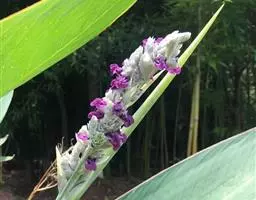 头状花序卵形,鹅蛋般大小,单独生于花葶上,花葶长短不一,苞片覆瓦状排列,宽卵形,宽约5厘米,里面的紫色;小苞片线形;萼片长圆形,长达2.5厘米;花冠紫堇色或白色,裂片长圆状披针形,长1.5厘米;外轮退化雄蕊倒卵状长圆形,淡紫茧色,长1.7厘米;硬革质的1枚与其相似,兜状的1枚长仅及其半;子房无毛。花期:5-6月。