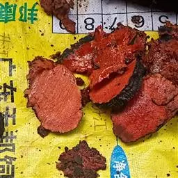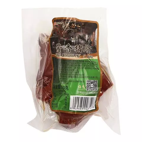 制作: ①将猪肉(五花肉)刮洗干净,放入清水中煮熟,捞出,去皮上的油水。马上抹上深色酱油使其上色。