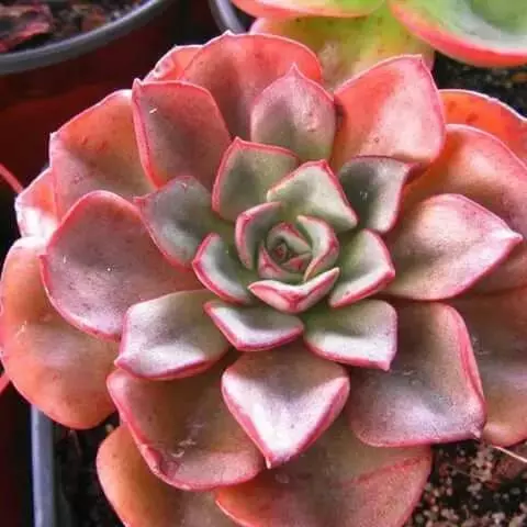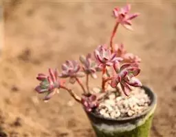 小红衣是景天科、拟石莲花属的一种多肉植物。叶片匙形,扁平细长,叶表具白粉,有明显的半透明边缘,…