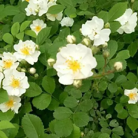 白蔷薇:直立灌木,高约2米;小枝有不等钩状皮刺,有时混有刺毛。小叶通常5,稀7,宽椭圆形或卵形,…
