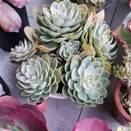 紫珍珠是景天科石莲花属的多年生肉质草本植物。植株中小型;叶片肉质,匙形,呈莲座状紧密排列;叶片粉紫色,…