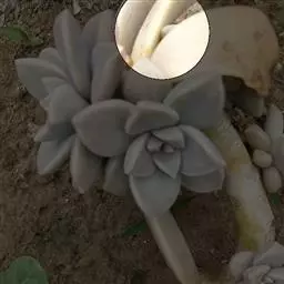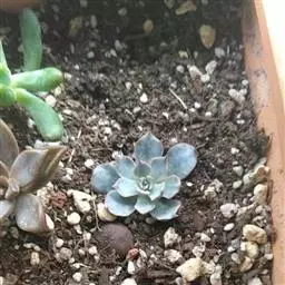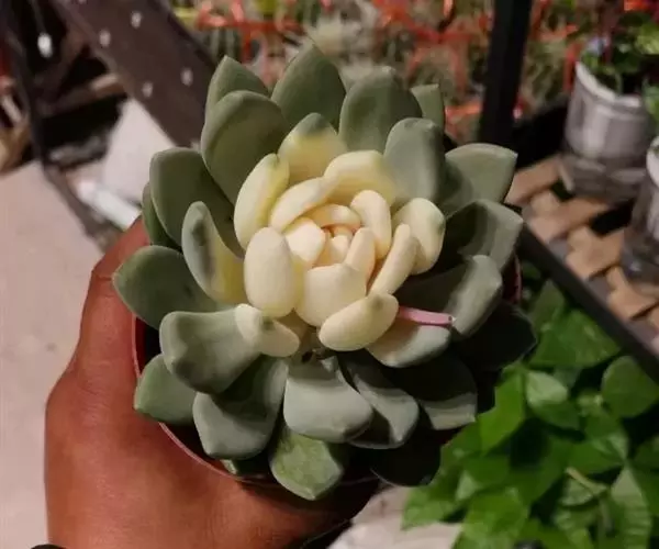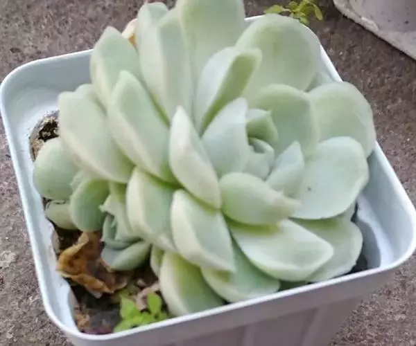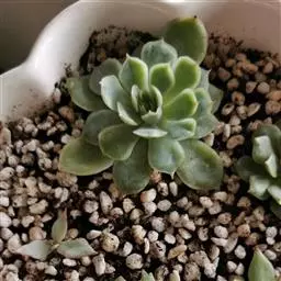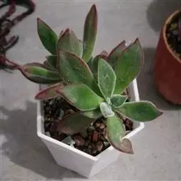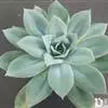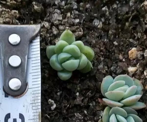 半圆形的叶片敦厚短小,顶部有细小叶尖,表面覆有白粉层,呈莲花座状排列。颜色偏绿,易生侧芽。喜欢阳光充足、通风良好的种植环境,耐半阴,生长速度慢。繁殖方式以叶插和扦插为主 。