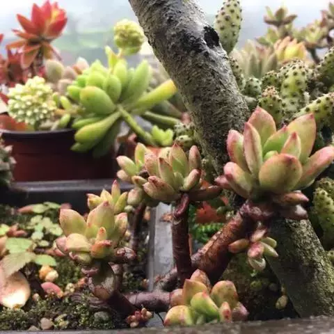 在阳光充足、温差大的环境下叶色会变得偏白。厚叶月影生长速度一般,为多年生植物,有小小的半木质茎,不容易长高,小苗不爱长侧芽,一旦成株开花后,才会大量萌发侧芽,群生的厚叶月影非常漂亮,厚叶月影花开穗状倒钟型花,五个花瓣,异株授粉。