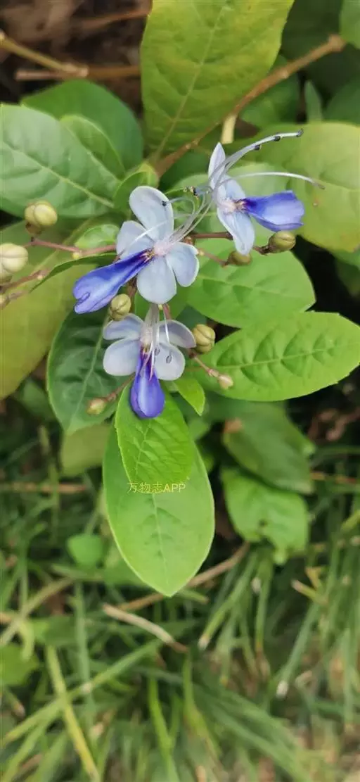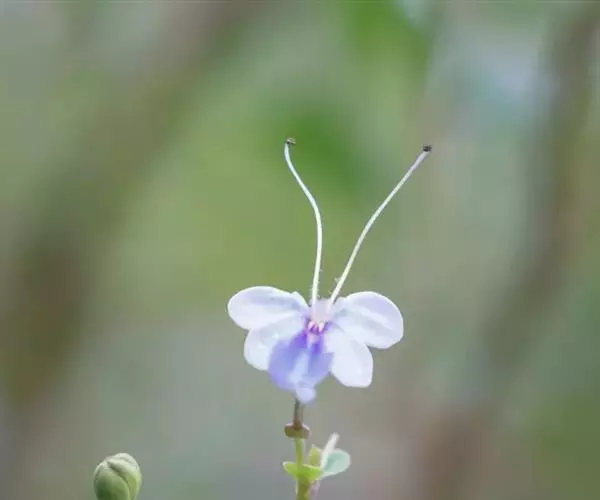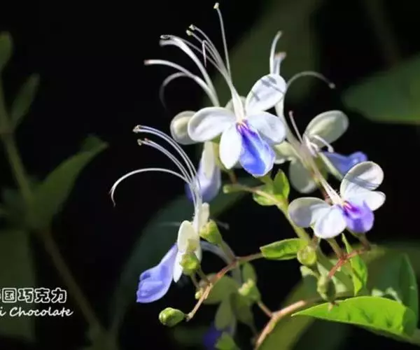 花:花朵造形似蝴蝶,花色为浅蓝到紫色,花瓣平展花冠两侧对称,花冠白色,唇瓣紫蓝色,雄蕊细长。