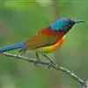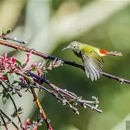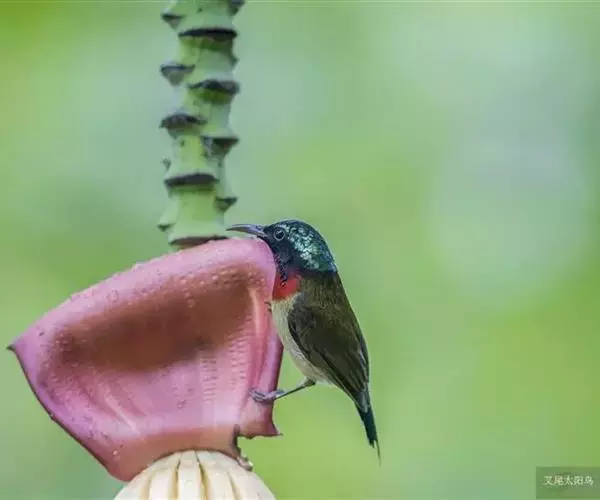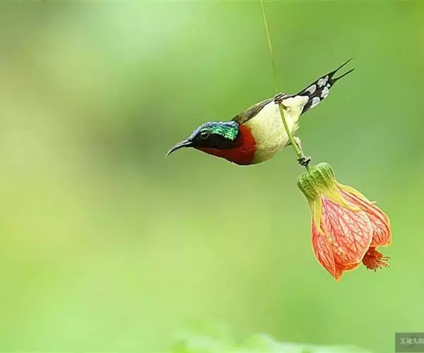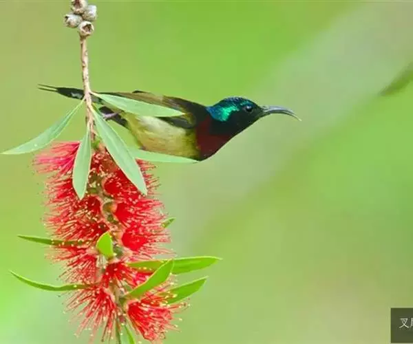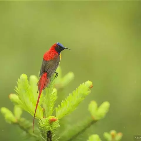 叉尾太阳鸟(学名:Aethopyga christinae),别称燕尾太阳鸟,是雀形目太阳鸟科一种体型非常小而纤弱的鸟,体长约9厘米,雄鸟头颈及尾上金属绿色,两根中央尾羽特别长,具赭红色的喉斑,上体橄榄色或近黑色,余部污橄榄白色;雌鸟较小,上体橄榄色,下体浅绿黄色 ;它们的嘴细长下弯,舌呈管状,专门用来吮吸花蜜,因此又被称为“亚洲蜂鸟” 。