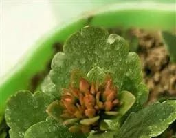 病害通常在花生开花下针时开始发生。病株枝叶丛生,节间短缩,严重矮化,多为健株株高1/2,病株叶片变小变厚,色深质脆,腋芽大量萌发,长出的弱小茎叶密生成丛,正常叶片逐渐变黄脱落,仅剩丛生的枝条。病害发展中、后期,花器变成叶状。果针不能入土或入土很浅或向上变成秤钩状,根部萎缩,荚果很少或不结实。