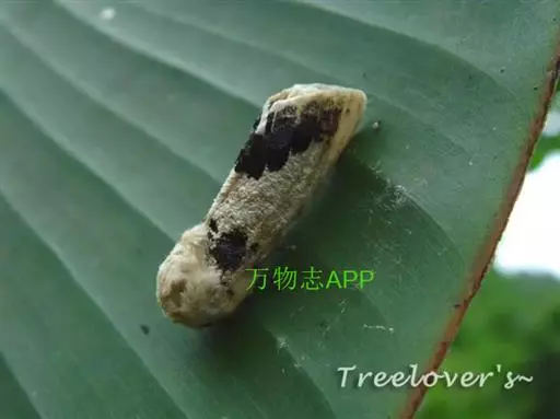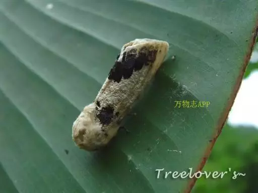 苹掌舟蛾幼虫图 5龄,末龄幼虫体长55mm左右,被灰黄长毛。头、前胸盾、臀板均黑色。胴部紫黑色,背线和气门线及胸足黑色,亚背线与气门上、下线紫红色。体侧气门线上下生有多个淡黄色的长毛簇。