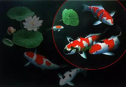 4.一条红锦鲤:在雄健的鱼体上,从头部至尾柄形成一优美的红色条带。
