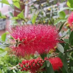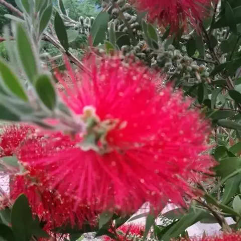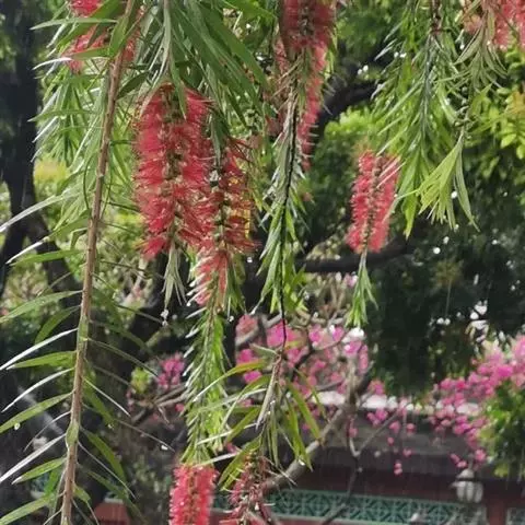 红千层是桃金娘科红千层属的常绿小乔木植物。红千层树皮坚硬,灰褐色,嫩枝有棱,初时有长丝毛,…