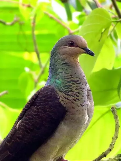斑尾鹃鸠体长38厘米,是体大而尾长的褐色鹃鸠。背及尾满布黑色或褐色横斑。头灰,颈背呈亮蓝绿色。胸偏粉,…