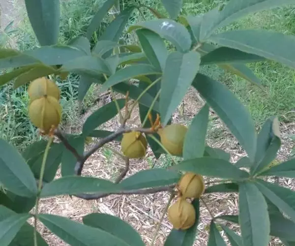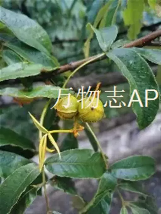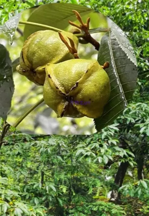 乔木,高达10-20米,胸径30-60厘米 山核桃生长期果实 ;树皮平滑,灰白色,光滑;小枝细瘦,新枝密被盾状着生的橙黄色腺体,后来腺体逐渐稀疏,1年生枝紫灰色,上端常被有稀疏的短柔毛,皮孔圆形,稀疏。 复叶长16-30厘米,叶柄幼时被毛及腺体,后来毛逐渐脱落,叶轴被 毛较密且不易脱落,有小叶5-7枚;小叶边缘有细锯齿,幼时上面仅中脉、侧脉及叶缘有 柔毛,下面脉上具宿存或脱落的毛并满布橙黄色腺体,后来腺体逐渐稀疏;侧生小叶具短的小叶柄或几乎无柄,对生,披针形或倒卵状披针形,有时稍成镰状弯曲,基部楔形或略成 圆形,顶端渐尖,长10-18厘米,宽2-5厘米,顶生小叶具长约5-10毫米的小叶柄,同上端的侧生小叶同形、同大或稍大。 雄性葇荑花序3条成1束,花序轴被有柔毛及腺体, 长10-15厘米,生于长约1-2厘米的总柄上,总柄自当年生枝的叶腋内或苞腋内生出。 雄花具短柄;苞片狭,长椭圆状线形,小苞片三角状卵形,均被有毛和腺体;雄蕊2-7枚, 着生于狭长的花托上,花药具毛。雌性穗状花序直立,花序轴密