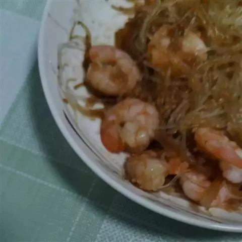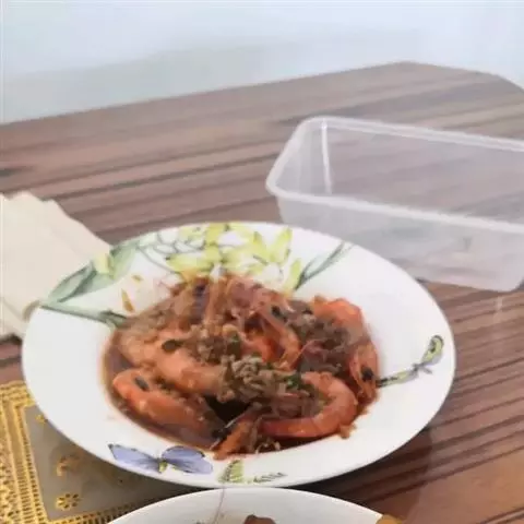 2、把所有泡过油的材料捞起,沥干油份;重新热锅,重新爆油,待油热后放入蒜片爆香,倒入土豆块和胡萝卜块,以2汤匙生抽、2茶匙砂糖、1茶匙鸡精加水加2碗清水调配成汁,倒入锅中,烧开后转小火焖5分钟;放入虾仁,加入2汤匙油咖喱,搅拌均匀后继续焖煮,待汁稍微收干变浓稠即可。(做咖喱菜式的时候偶喜欢保留比较多的汁,用来拌饭或其他主食感觉很棒哦