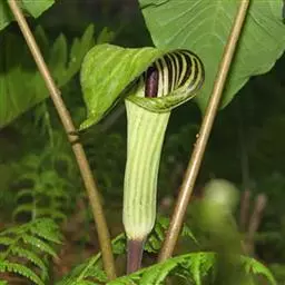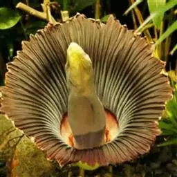 花序柄长15-30厘米,粗1-3厘米,绿色,粗糙。佛焰苞厚革质,宽卵形,舟状,近直立,先端具喙,长20-25厘米,人为展平宽15-17.5厘米,苍白带黄色。肉穗花序近圆柱形,长17.5-20厘米,粗4-5厘米,淡黄色。雄蕊花丝线形,花粉黄白色。雌蕊陀螺状,长7-8毫米,柱头小,线形,纵向,黄色,稍凸起。浆果淡黄色,柱头周围有青紫色斑点,长1厘米,粗7.5毫米。花期8-9月,果于异年花期之后成熟。