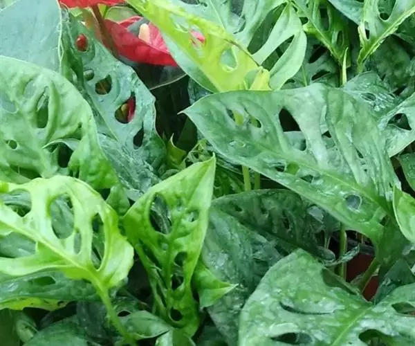 龟背竹(Monstera):是泽泻目、天南星科的一属植物,约50种,分布于美洲热带地区,中国引入栽培有龟背竹(M. deliciosa Liebm. )1种,供观赏,北方冬天则须栽于温室。攀援灌木;叶2列,叶柄具鞘,叶片异向旋转,成熟植株上的通常为长圆形,不等侧,有时具空洞,花序柄由枝顶附近单出形成扇形的合轴;佛焰苞舟状展开,脱落;肉穗花序无梗;花多而密。