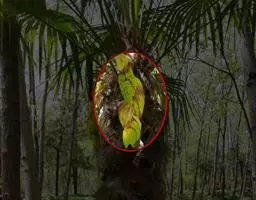 叶柄绿色,长常达1米,腹面扁平,宽4-5厘米,背面钝圆,粗糙,边缘锐尖,基部甚宽,对折抱茎,排列为覆瓦状,形如鸢尾,两侧叶鞘宽,向上渐狭,脱落后叶柄边缘成绉波状;叶片大,轮廓心状卵形,宽40-60厘米,厚革质,表面发亮,淡绿色,背面绿白色,边缘羽状分裂,侧脉间有1-2个较大的空洞,靠近中肋者多为横圆形,宽1.5-4厘米,向外的为横椭圆形,宽5-6厘米;中肋及侧脉表面绿色,背面绿白色,两面均隆起;I次侧脉8-10对,基部的相互靠近,向上渐远离,II、III、IV级叶脉网状,不明显。