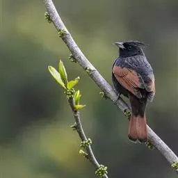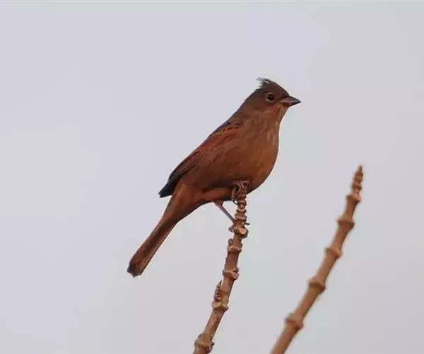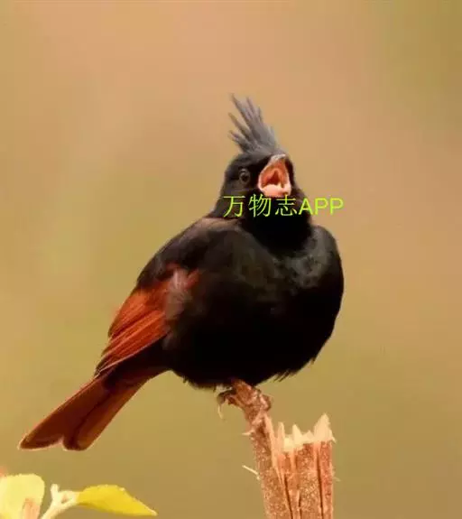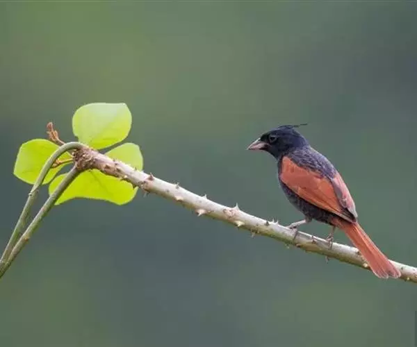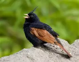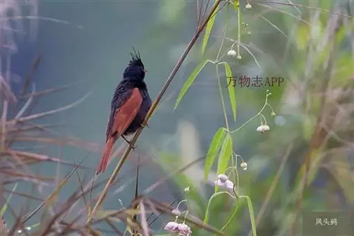 凤头鹀(学名:Emberiza lathami):属小型鸣禽,体重21-31克,体长134-175毫米。以头顶的细长羽冠为特征,雄鸟全身几乎均为黑色具蓝色光泽,两翅和尾以及尾上覆羽栗红色。雌鸟具短的褐色羽冠,上体暗橄榄褐色,两翅暗褐色具栗色或栗红色羽缘。尾暗褐色,最外侧一对尾羽几乎全为栗色或栗红色,次一对的外侧尾羽具大的楔状白斑。下体污皮黄色或暗褐皮黄色,胸具窄的黑色纵纹。